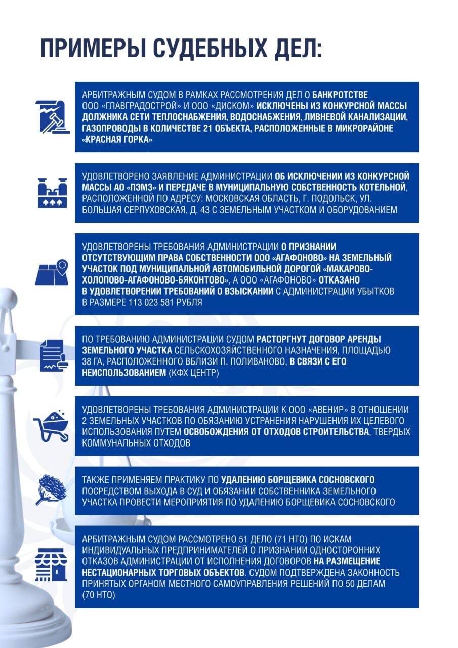 Среди наиболее значимых судебных решений — сохранение за округом важной инженерной инфраструктуры, восстановление права муниципальной собственности на автомобильную дорогу и признание законности принятых администрацией решений по нестационарным торговым объектам. Отдельно стоит выделить дело, длившееся более двух лет: по итоговому решению суда снесены аварийные недостроенные объекты, представлявшие реальную угрозу для жителей.