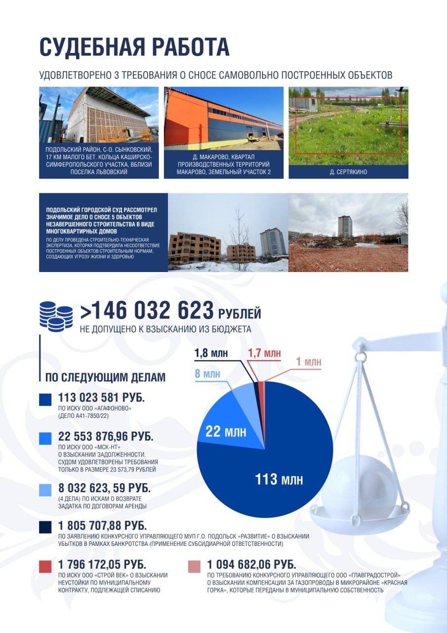 Существенную часть работы составило судебное сопровождение. В 2025 году интересы округа были представлены более чем в тысяче судебных дел. Благодаря выстроенной правовой защите в бюджет поступило свыше 75 млн рублей, а также не допущено к взысканию из бюджета округа средств в размере более 146 млн рублей. Кроме того, через суд удалось добиться ликвидации несанкционированных свалок,приведения земельных участков в надлежащее состояние и многого другого.
