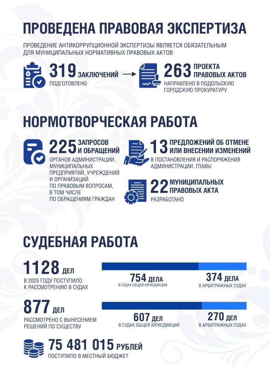 Подведены итоги работы правового управления за 2025 год. Это одно из ключевых подразделений администрации Подольска: от его деятельности напрямую зависят законность принятых решений и защита интересов муниципалитета.