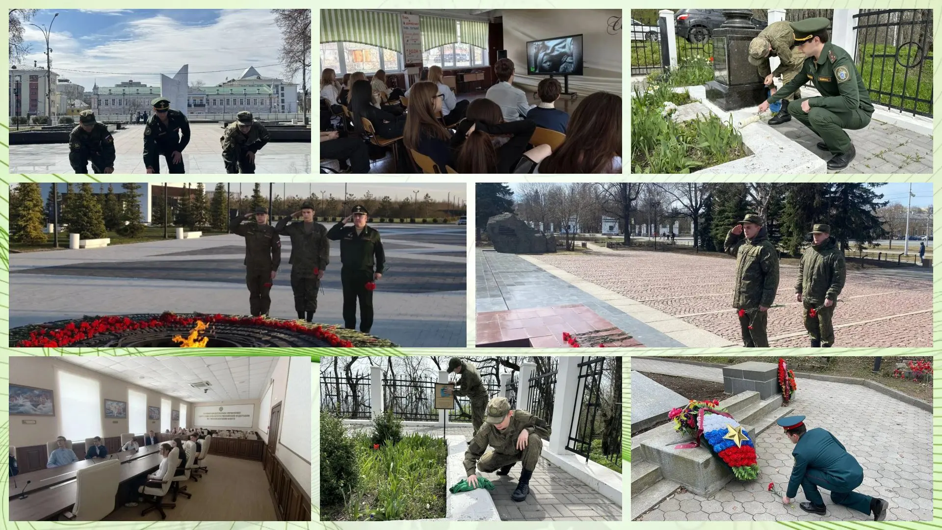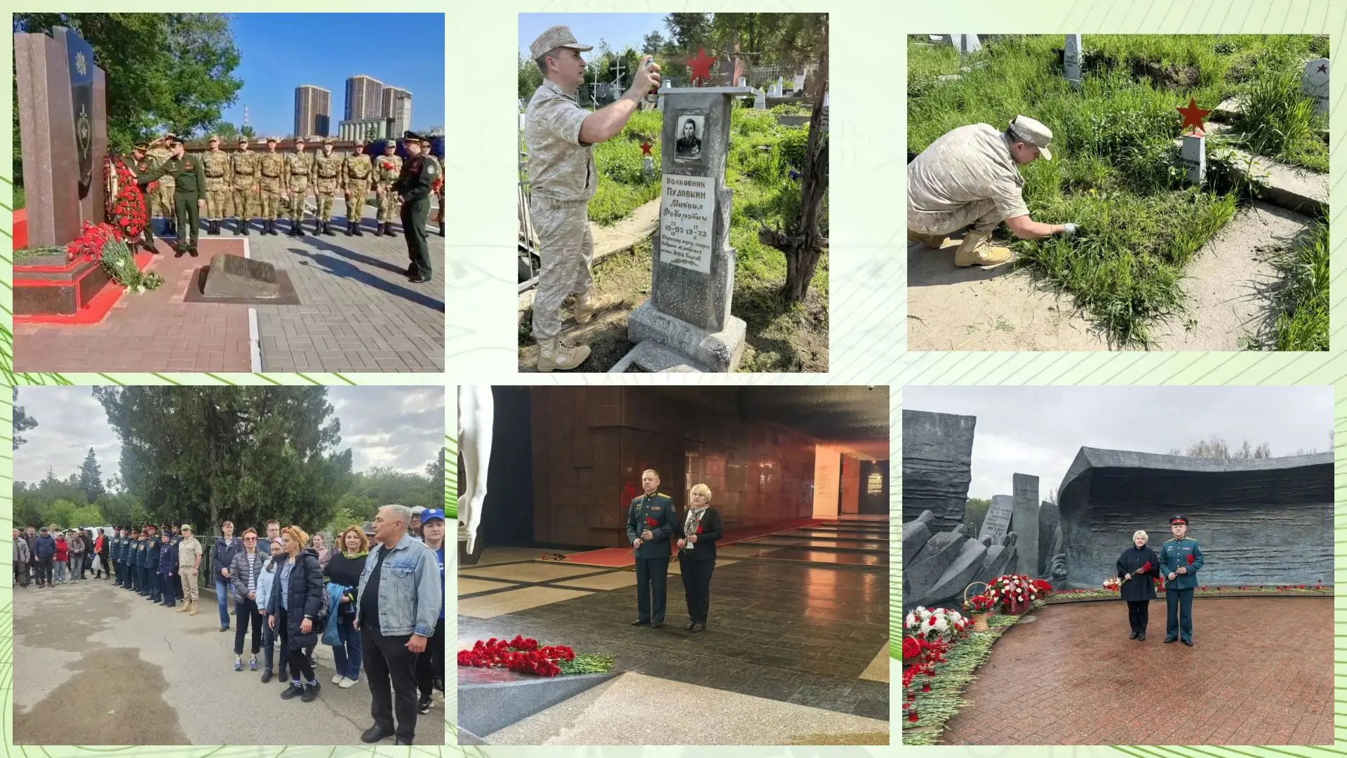 Так, сотрудники военных следственных органов возложили цветы и венки к мемориалам, братским могилам и памятникам Великой Отечественной войны, приняли участие в субботниках по благоустройству мест захоронений, провели уроки мужества и патриотические занятия со школьниками и кадетами. Мероприятия прошли в Москве и Московской области, Ростове-на-Дону, Пятигорске, Санкт-Петербурге, Воркуте, Пскове, Владивостоке, Донецке и Душанбе.
