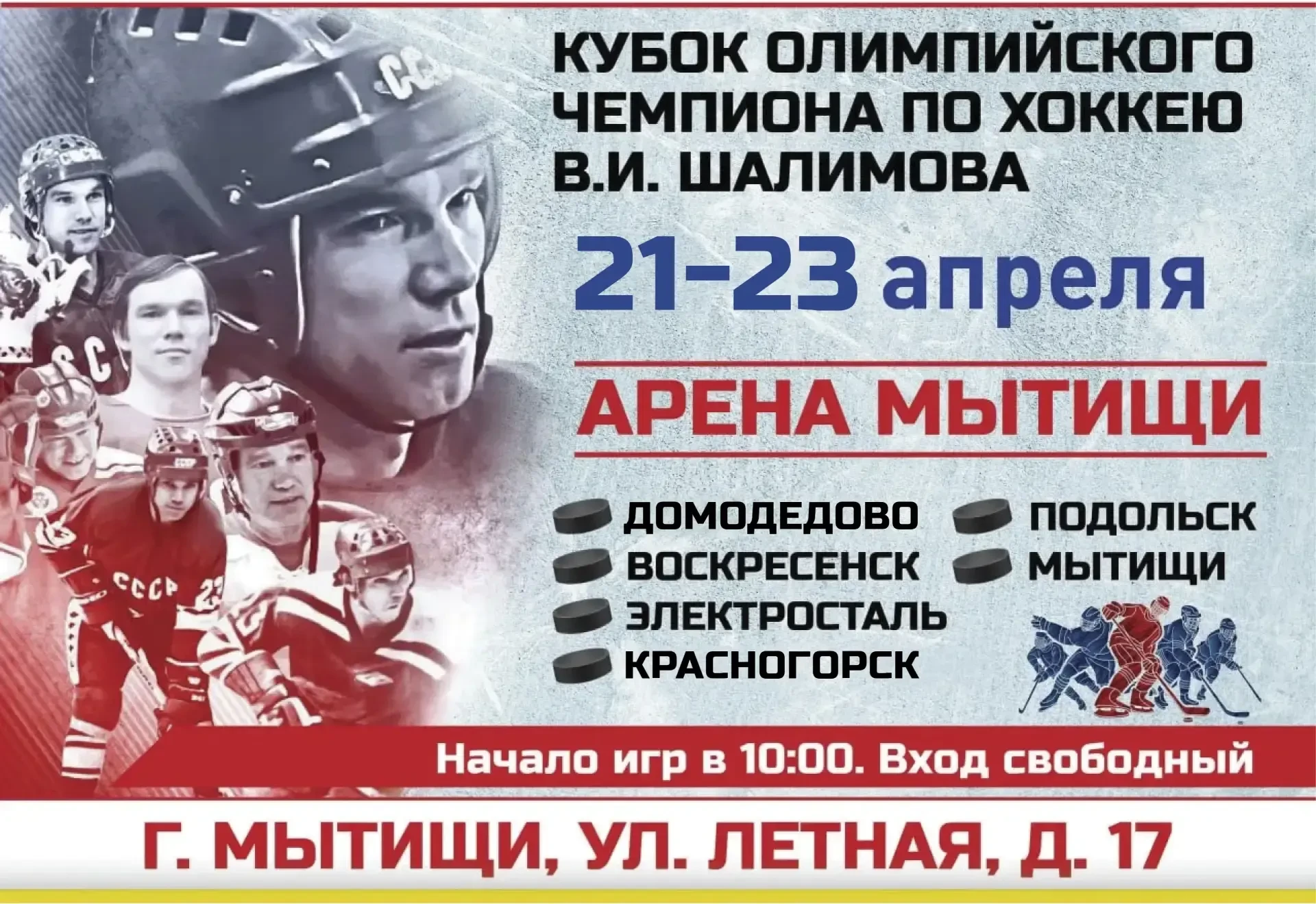 С 21 по 23 апреля на «Арене Мытищи» имени В.И. Шалимова пройдет хоккейный турнир на Кубок олимпийского чемпиона по хоккею В.И. Шалимова» среди юношеских команд 2016 года рождения.