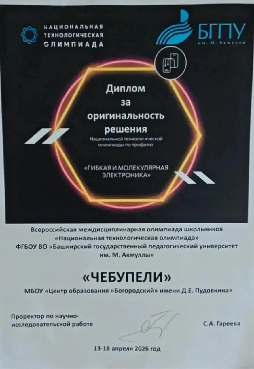 По итогам соревнований участники получили специальную номинацию жюри — диплом за оригинальность решения. Эксперты отметили нестандартный инженерный подход и перспективность предложенной идеи.