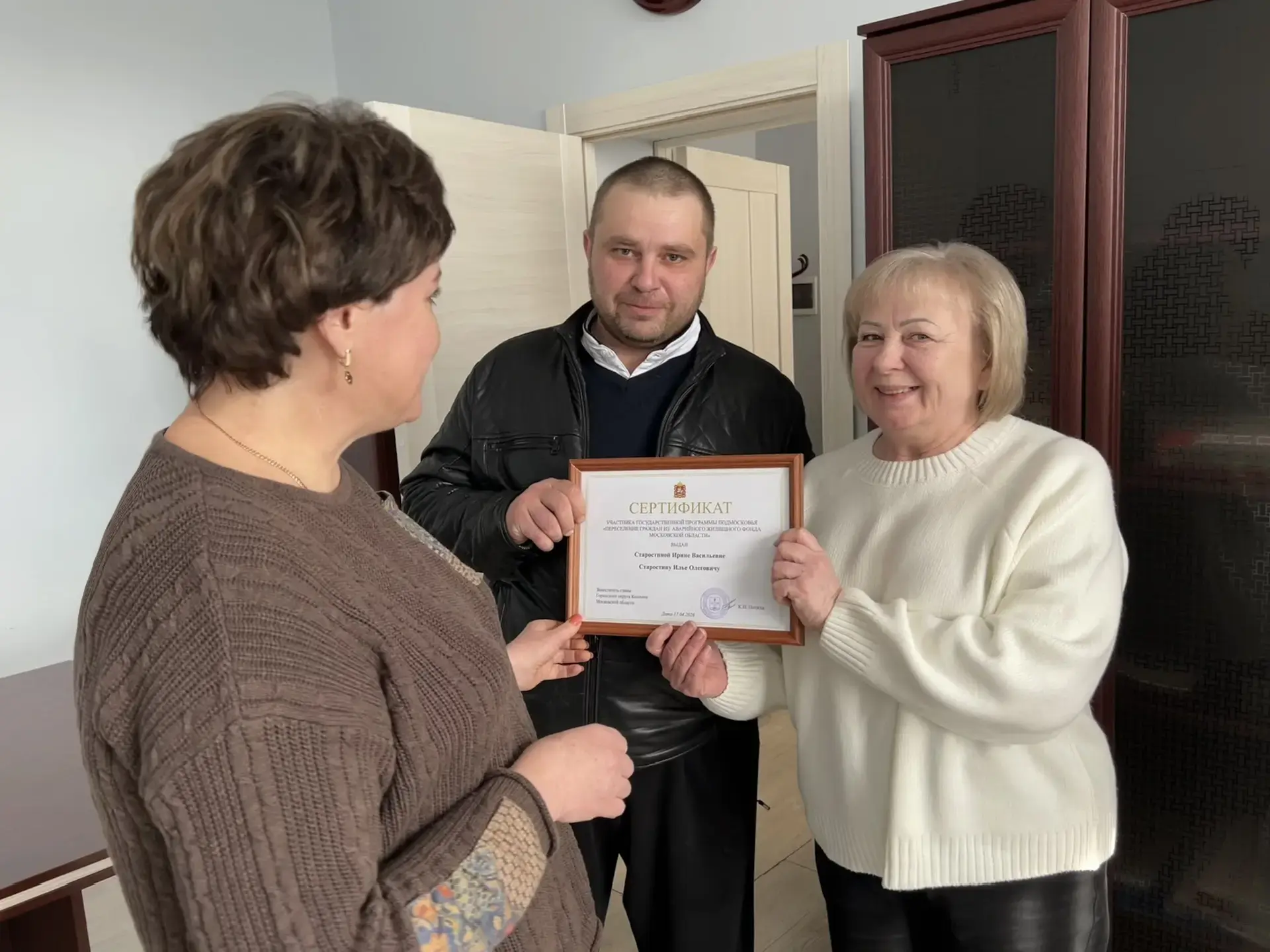 Документ, позволяющий оплатить покупку новой квартиры за счет государства, получили две семьи – жильцы аварийных домов на улице Набережная в Коломне и на улице Первомайская в поселке Лесной. Жилищные сертификаты и памятные подарки им вручила начальник управления имущества и земельных отношений администрации Городского округа Коломна Вера Громова.