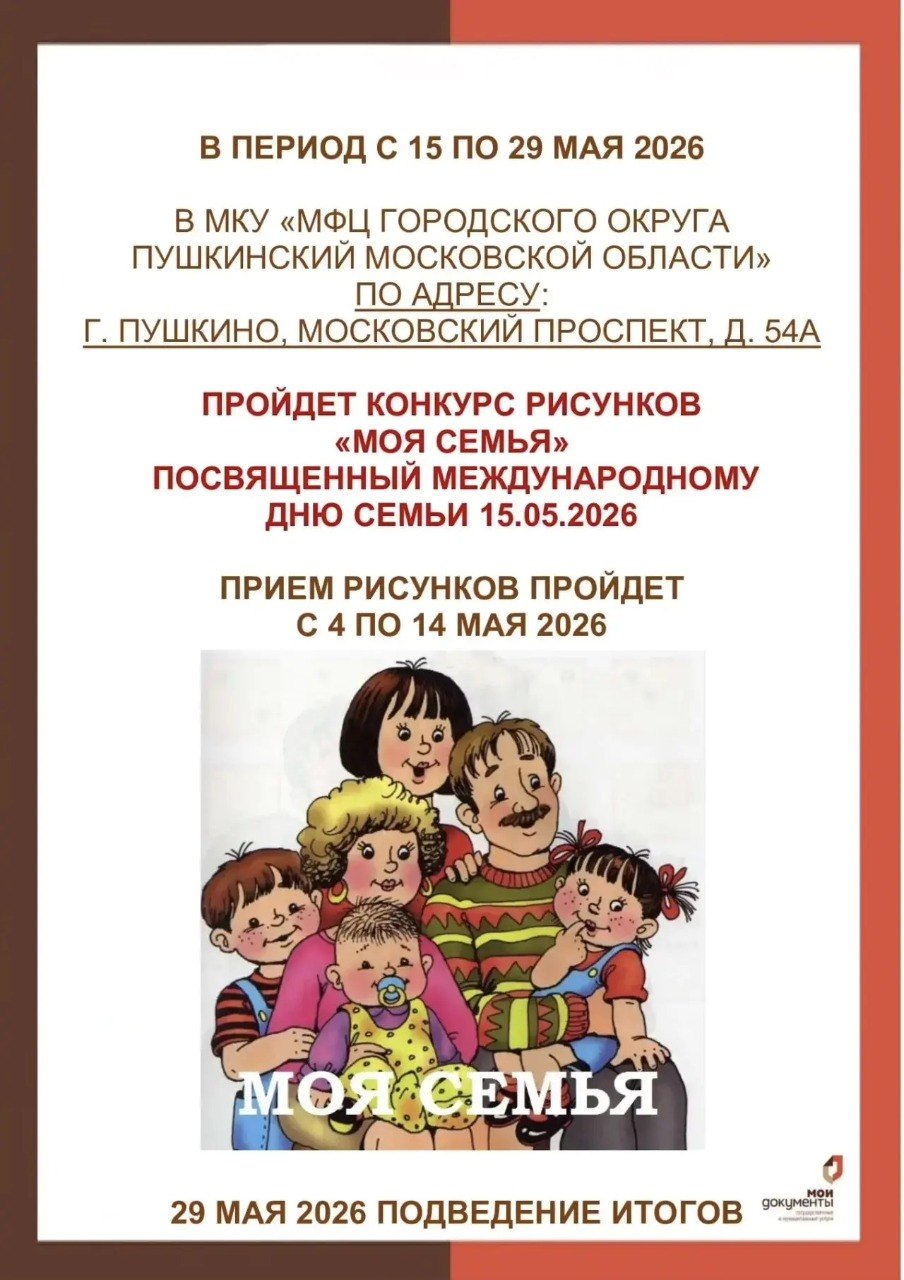 С 15 по 29 мая в «МФЦ г.о. Пушкинский Московской области» пройдет конкурс рисунков «Моя семья», посвященный Международному Дню Семьи