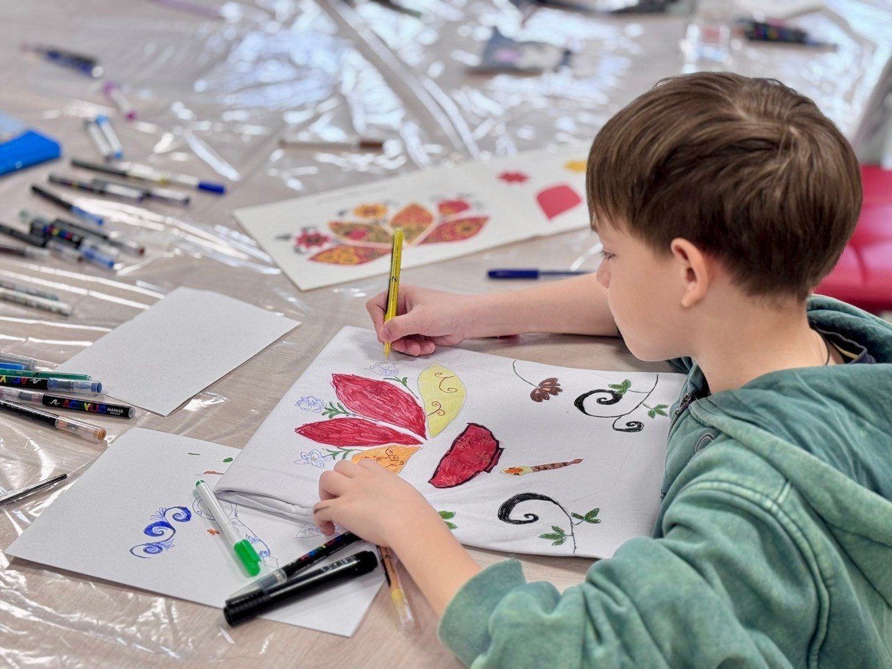 На мастер-классе «Узоры России» мастерицы расшивали рушник атласными лентами. Ведь в древности рушник, вышитый соответствующими узорами - символами, был неотъемлемым атрибутом многих обрядов. Важные события в жизни народа никогда не обходились без рушников. А на мастер-классе «Народные орнаменты» ребята расписали футболки национальными орнаментами.
