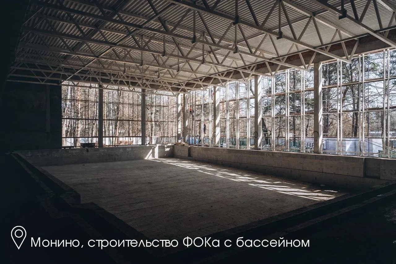 Также продолжаем строить в Монино ФОК с бассейном на месте старого здания. Готовность — около 45%. Комплекс откроем до конца года. Здесь появятся бассейн на 6 дорожек, зал для «сухого плавания». Он станет базой школы олимпийского резерва и будет открыт для жителей, включая участников «Активного долголетия».