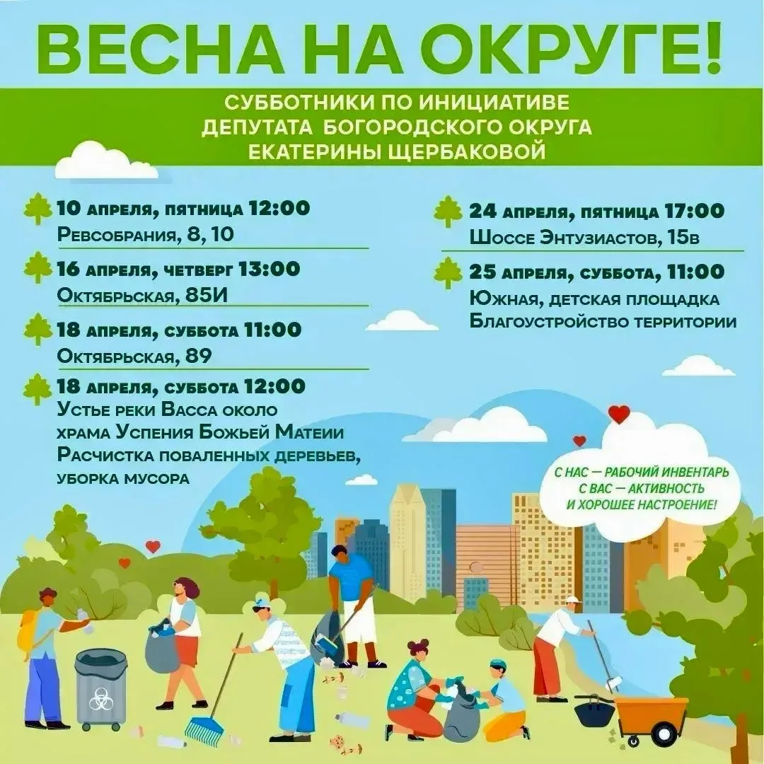 Полный список адресов субботника на 25 апреля доступен по ссылке: http://bgo-online.ru/2026/04/22/zhitelej-bogorodskogo-okruga-priglashajut-na-subbotniki-25-aprelja/