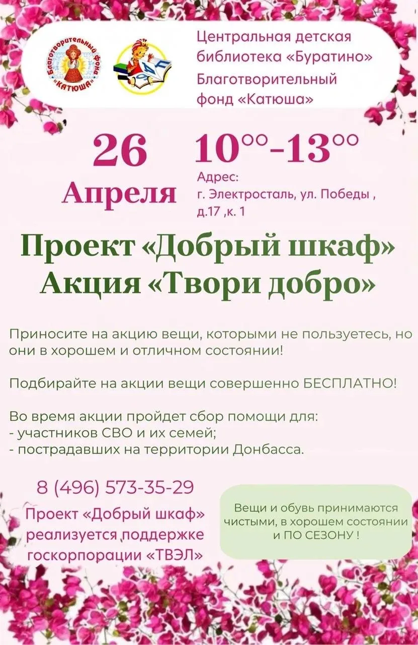 Если у вас есть сезонная одежда и обувь (новые или б/у, но в хорошем состоянии), книги или игрушки, и вы ими не пользуетесь, можете принести их в библиотеку «Буратино» (ул. Победы, д. 17, корп. 1) с 10:00 до 13:00.