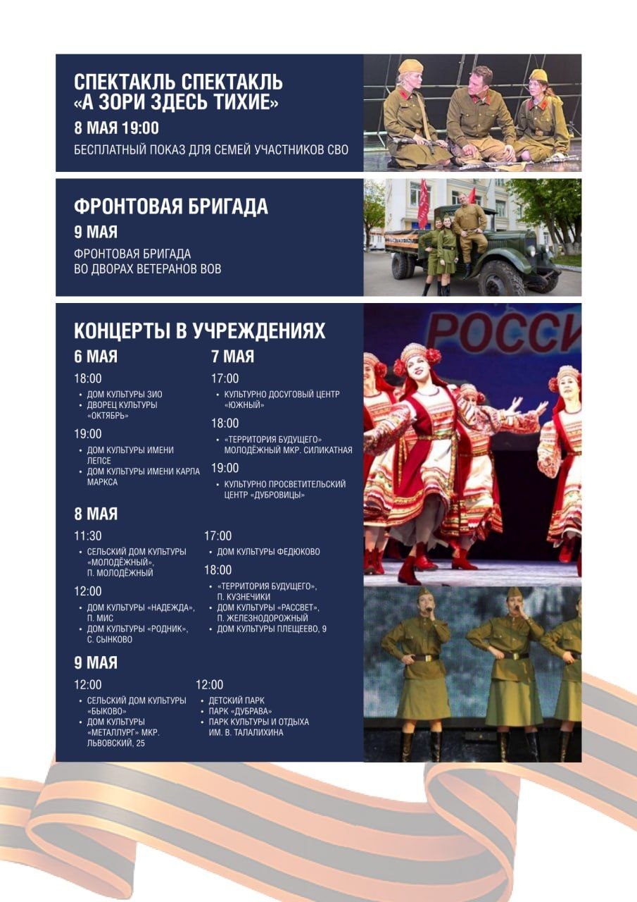 9 мая — центральный день празднования. Пройдут возложения цветов у мемориалов и памятников воинской славы, торжественные мероприятия на площади Славы и в микрорайонах округа. Будет развернута масштабная копия Знамени Победы. Во дворах ветеранов выступят фронтовые концертные бригады — эта традиция остаётся одной из самых тёплых и значимых.
