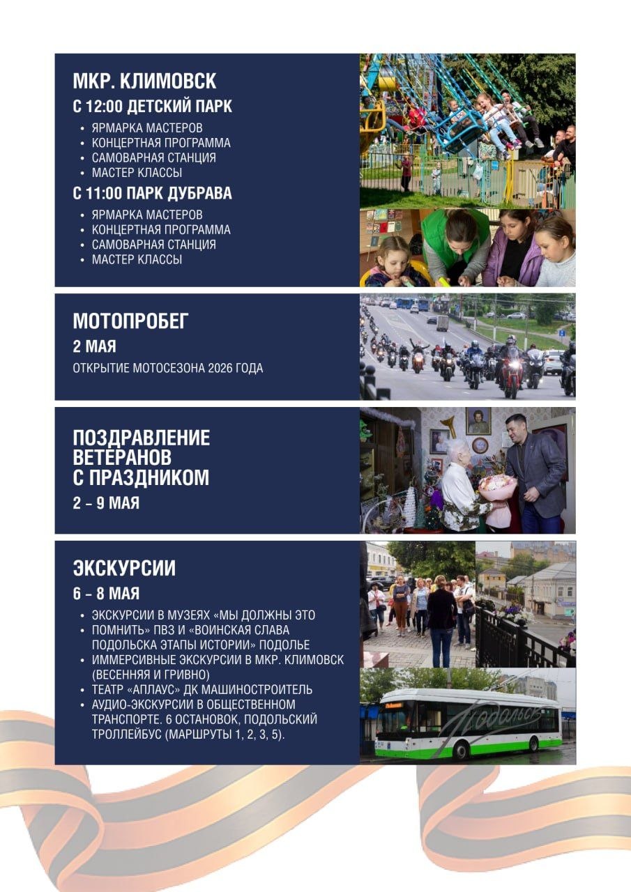 Май в Подольске — насыщенный и важный месяц: встречаем праздник Весны и Труда, готовимся отметить День Победы.