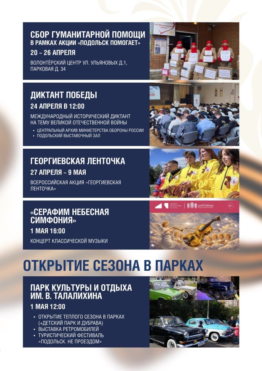 Особое внимание уделяем подготовке ко Дню Победы. В Подольске уже стартовали патриотические и благотворительные акции. Продолжается акция «Подольск помогает» — жители активно собирают гуманитарную помощь для наших защитников. Присоединиться может каждый.
