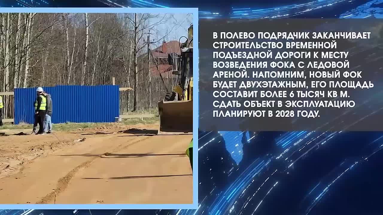 В Полево подрядчик заканчивает строительство временной подъездной дороги к месту возведения ФОКа с ледовой ареной. Напомним, новый ФОК будет двухэтажным, его площадь составит более 6 тысяч кв. м. Сдать объект в эксплуатацию планируют в 2028 году.