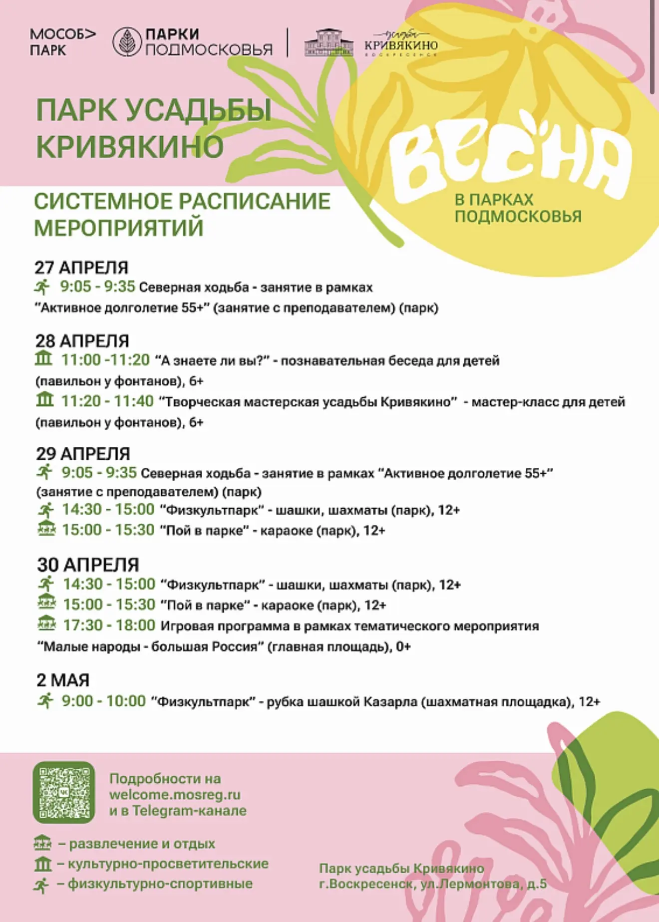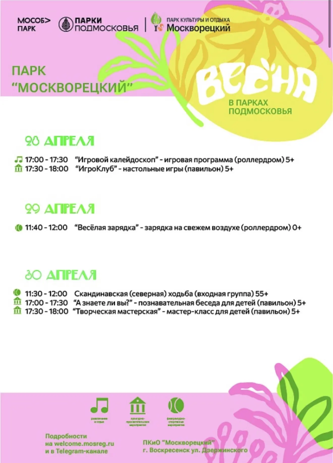 Парки Воскресенска приглашают гостей и жителей округа на мероприятия с 27 апреля по 3 мая 2026 года.