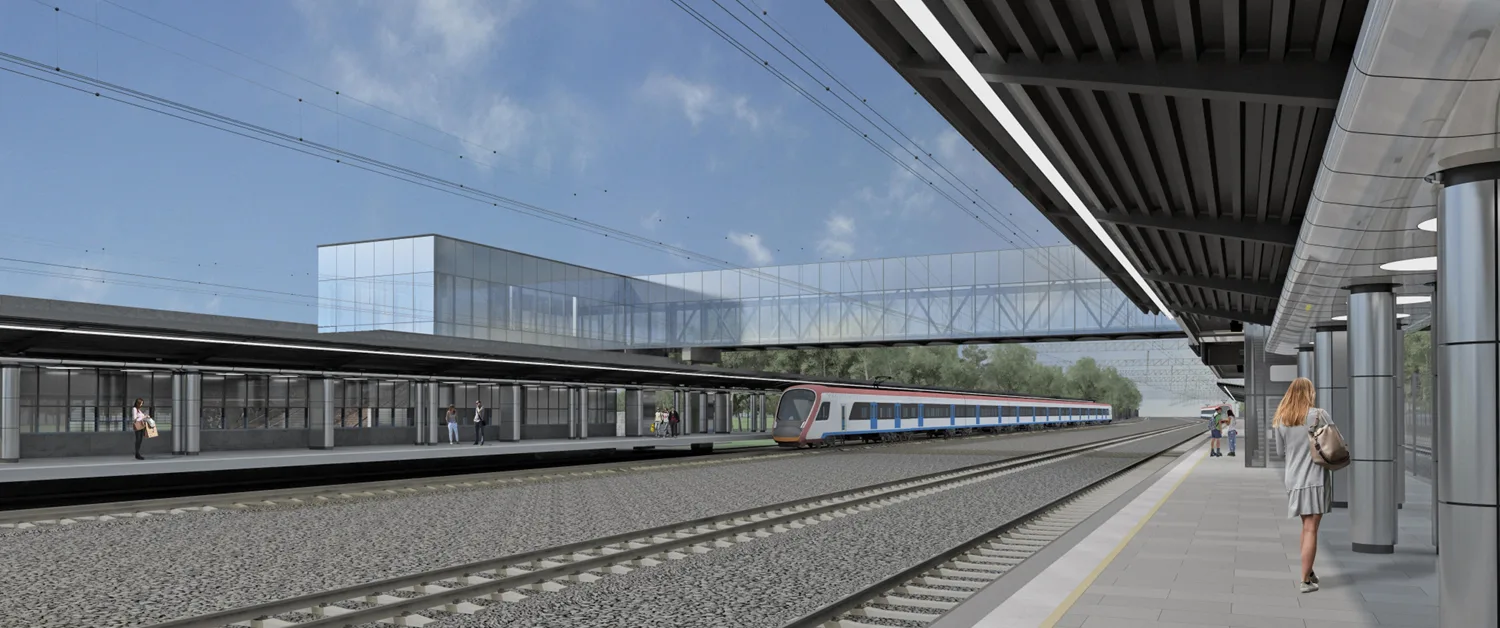 площадки с зонами отдыха и велопарковкой, тротуары, освещение и озеленение у станции