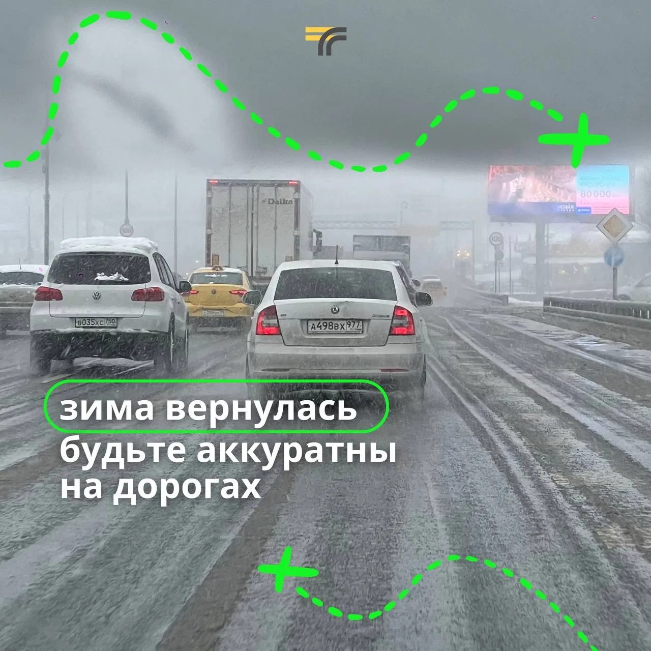 Сейчас из-за снега с ветром видимость на дорогах снижена — будьте предельно внимательны, не совершайте резких манёвров.