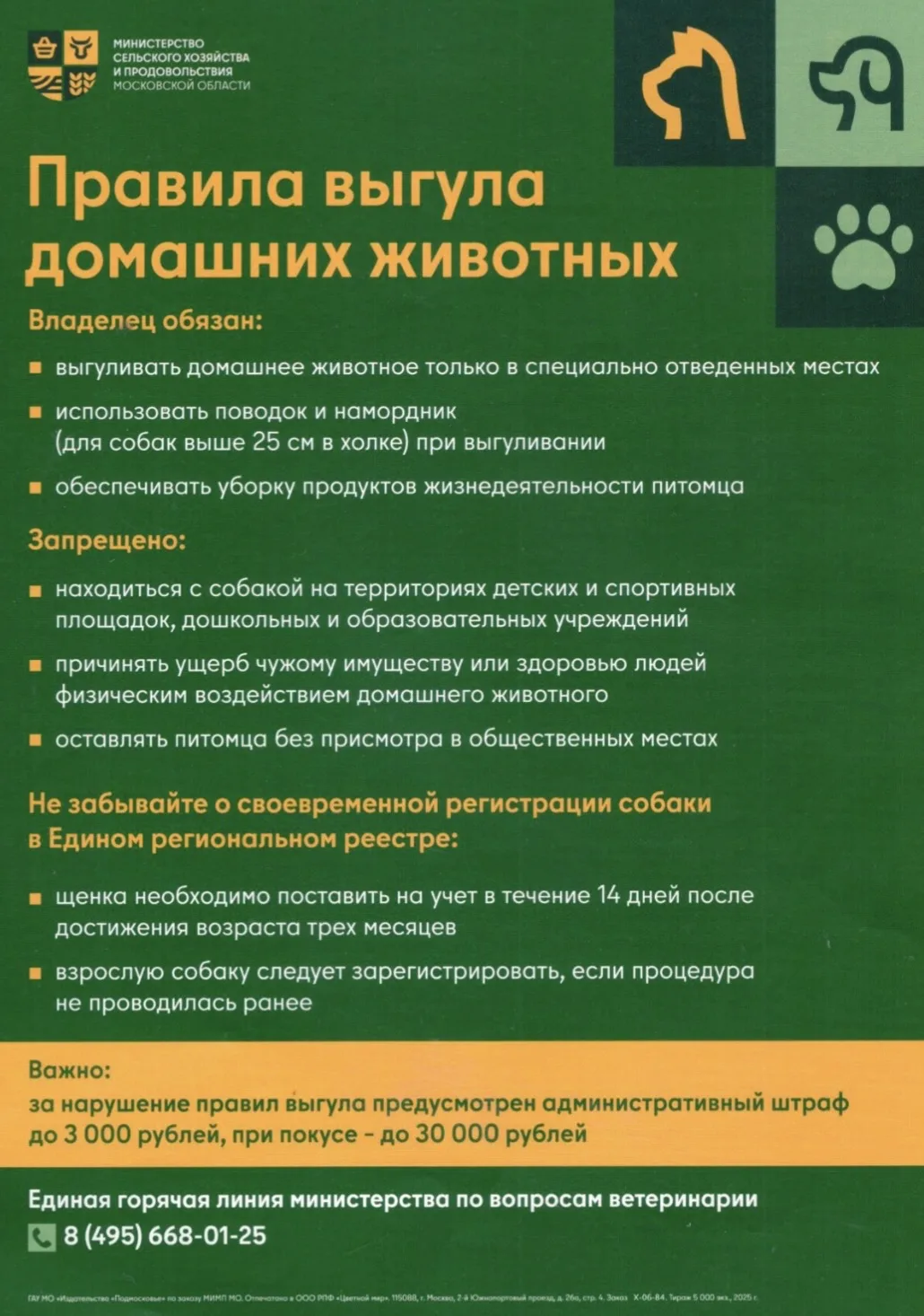 Министерство сельского хозяйства и продовольствия Московской области напоминает жителям о правилах выгула домашних животных, а также о возможности зарегистрировать питомца онлайн без посещения ветеринарного учреждения.