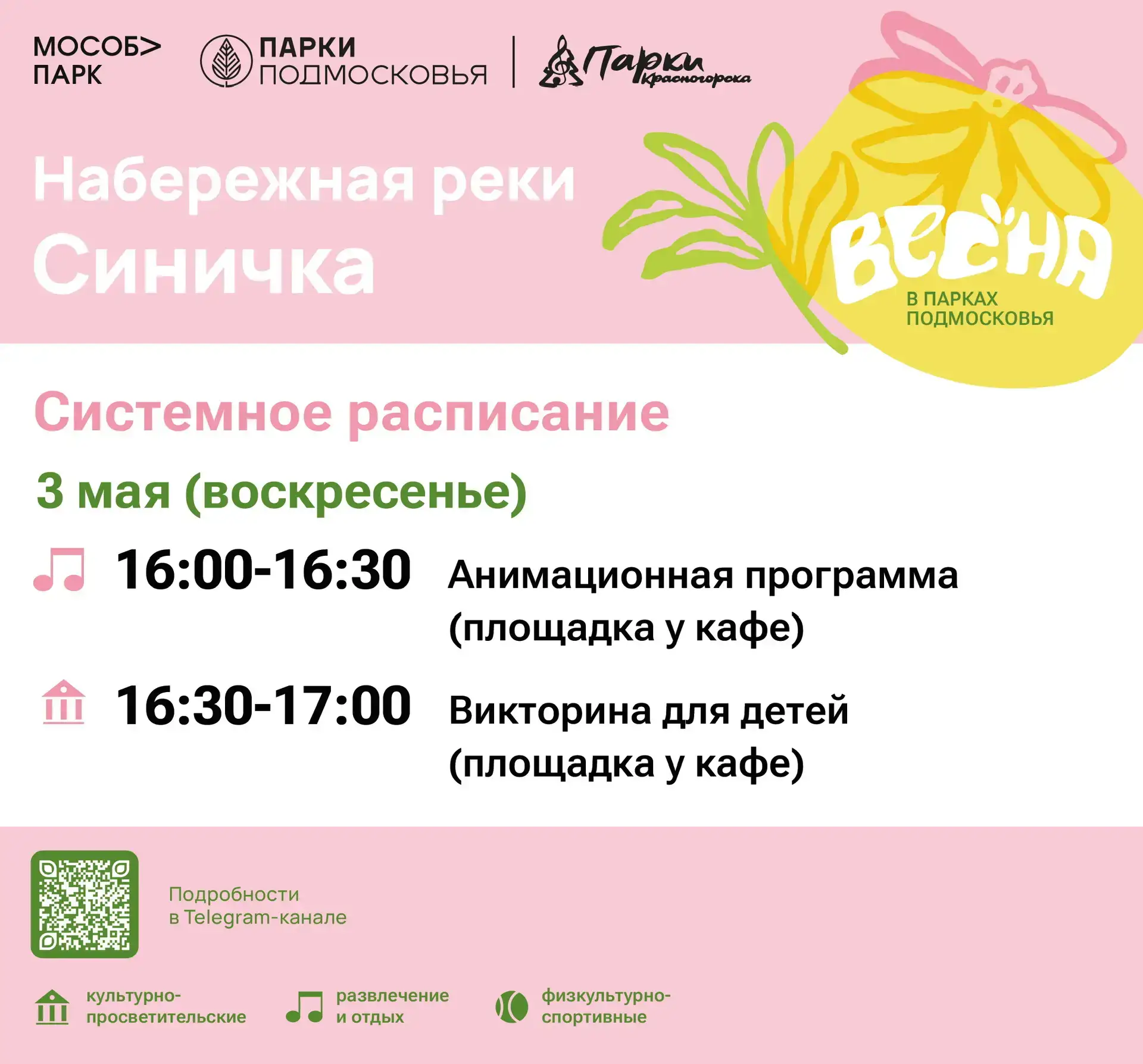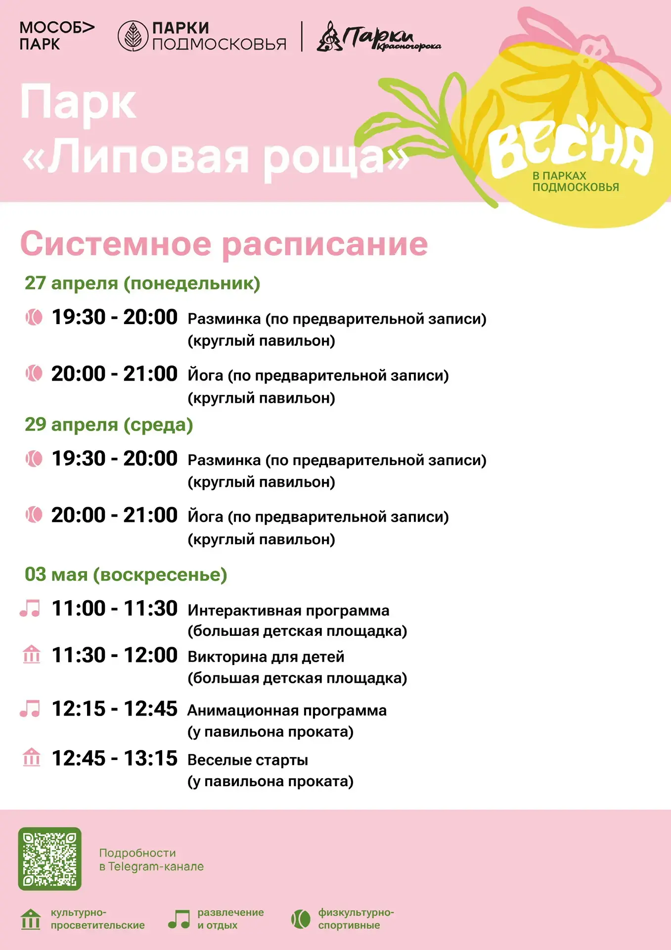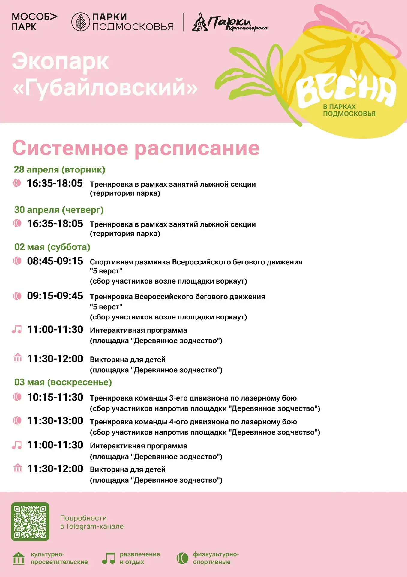 Афиша мероприятий на парковых территориях с 27 апреля по 3 мая.