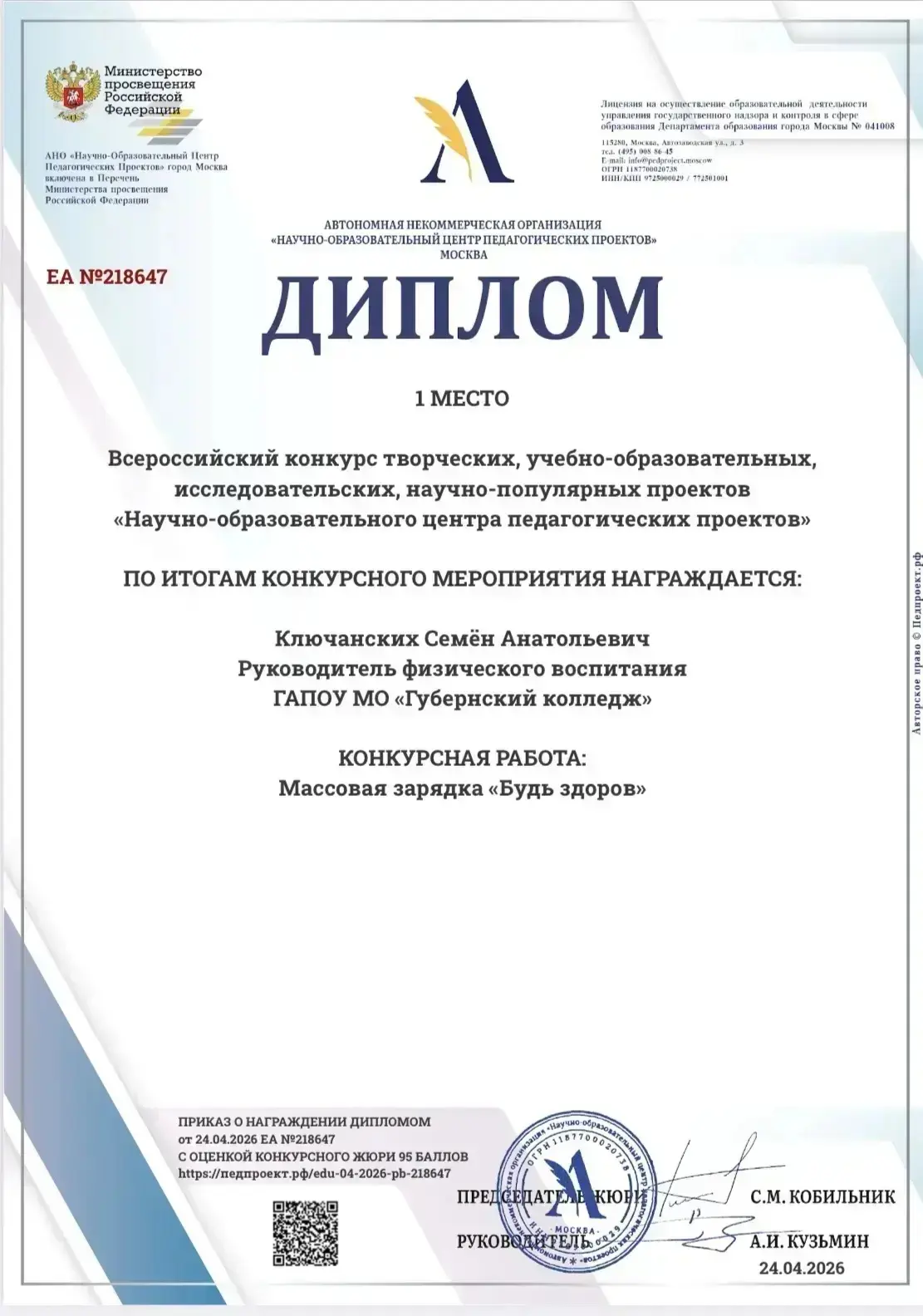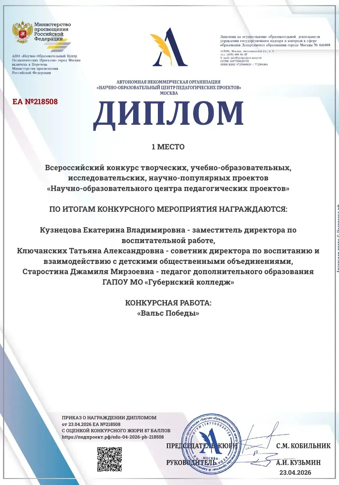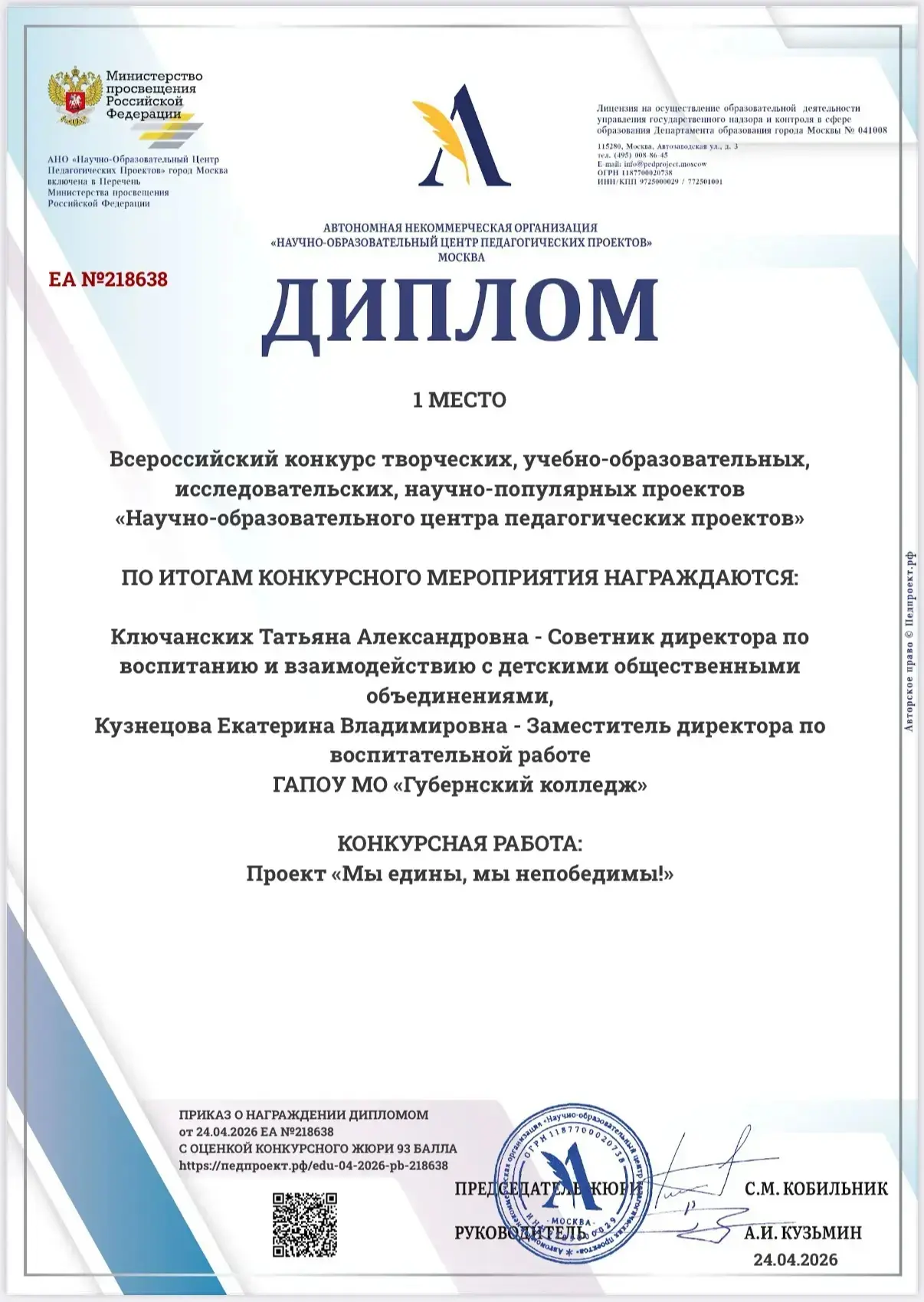 Сразу три проекта Губернского колледжа удостоены Диплома Победителя во Всероссийском конкурсе творческих, учебно-образовательных, исследовательских, научно-популярных проектов, организованном Автономной некоммерческой организацией «Научно-образовательный центр педагогических проектов».