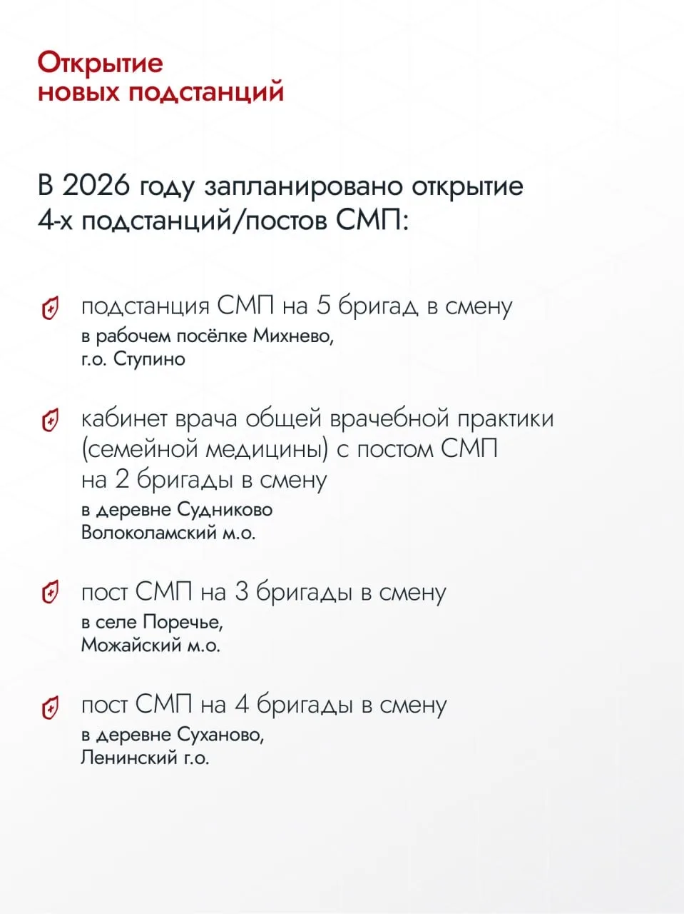 Ваша служба не прекращается ни на минуту. Днём и ночью, в любую погоду подмосковная «скорая» всегда на страже. Наша задача – делать всё, чтобы ваша работа становилась комфортнее: мы продолжаем открывать подстанции, обновлять автопарк и внедрять современные технологии.