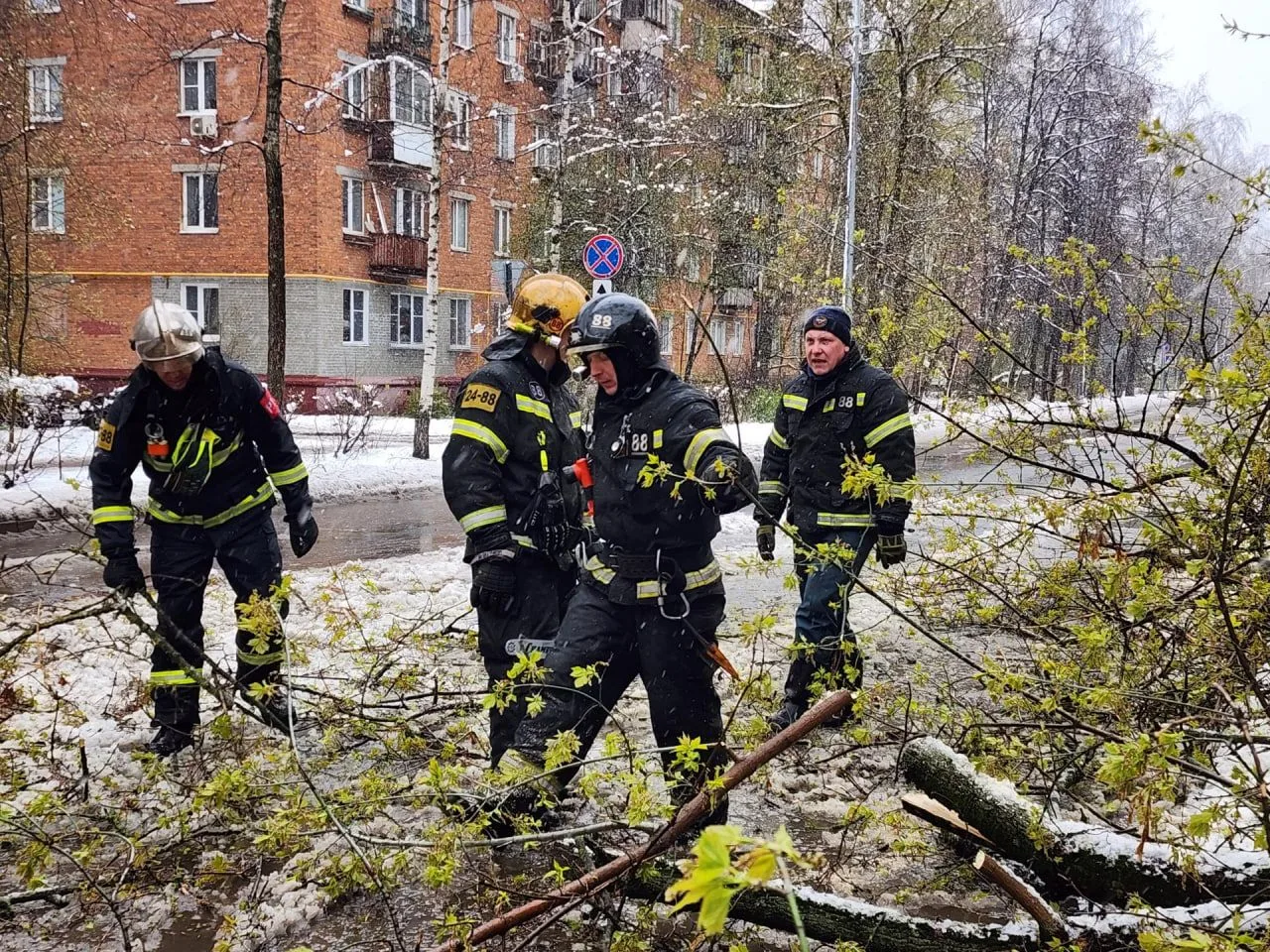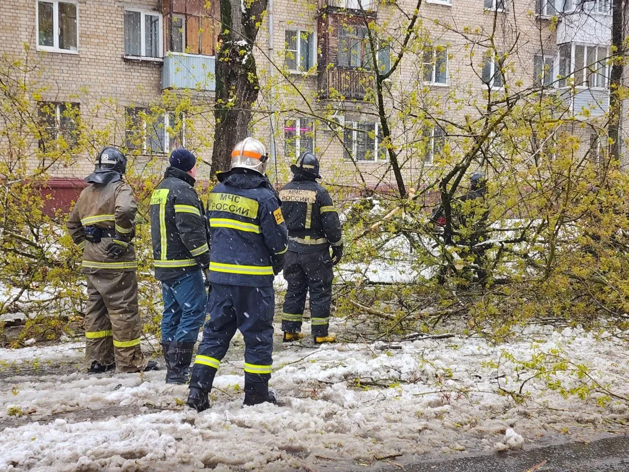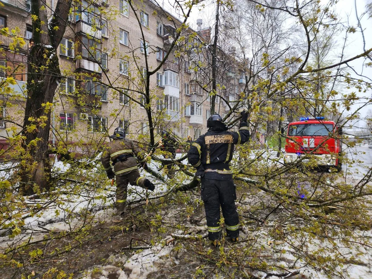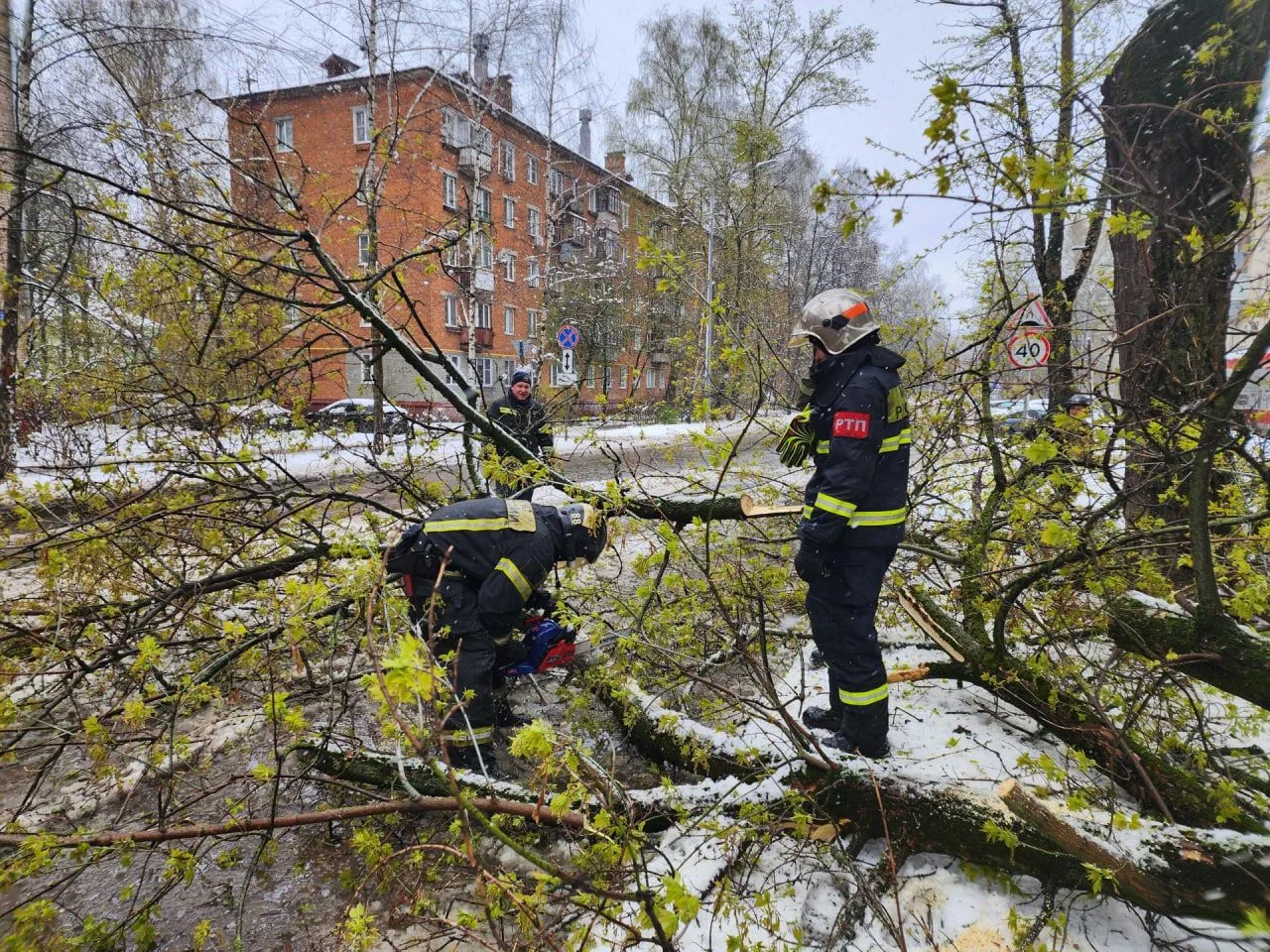 В Королёве сотрудники пожарно-спасательных частей присоединились к городским службам для ликвидации последствий сильного апрельского снегопада. Мокрый снег, налипший на ветви, стал причиной массового падения деревьев на проезжие части и тротуары.