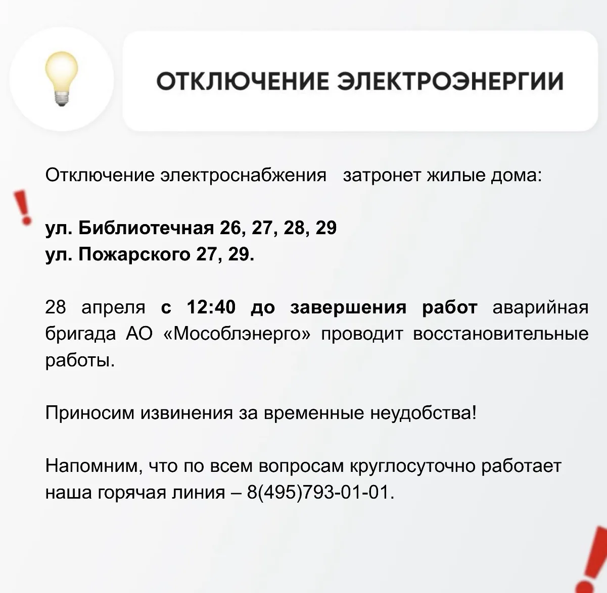 По уточнённым данным, планируемое время подачи э/э 18:00. По всем вопросам обращайтесь в ЕДДС по тел.: 8 (495) 408-7222, круглосуточно. Приносим извинения за временные неудобства.// Администрация городского округа Долгопрудный