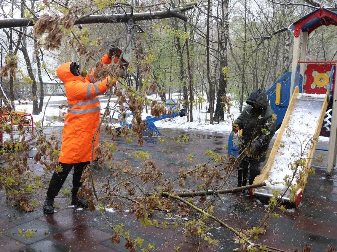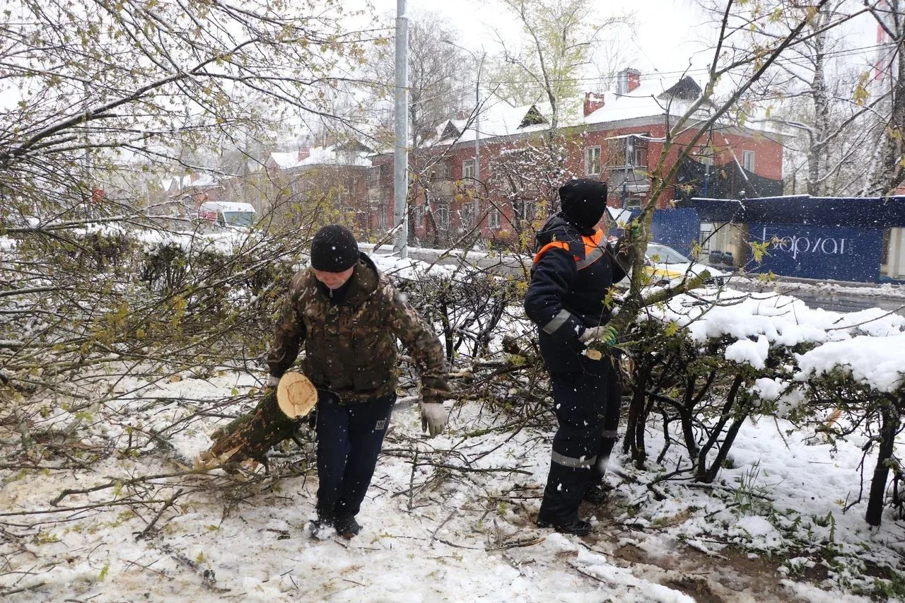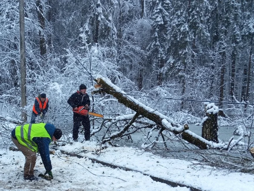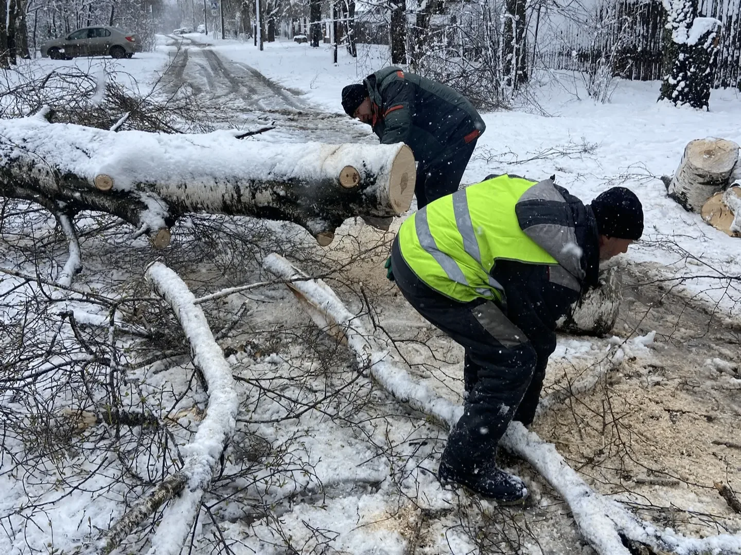 С раннего утра коммунальные службы городского округа Мытищи продолжили ликвидацию последствий мощного североатлантического циклона, начавшегося вчера. Тяжелый мокрый снег в сочетании со шквалистым ветром привел к падению деревьев.