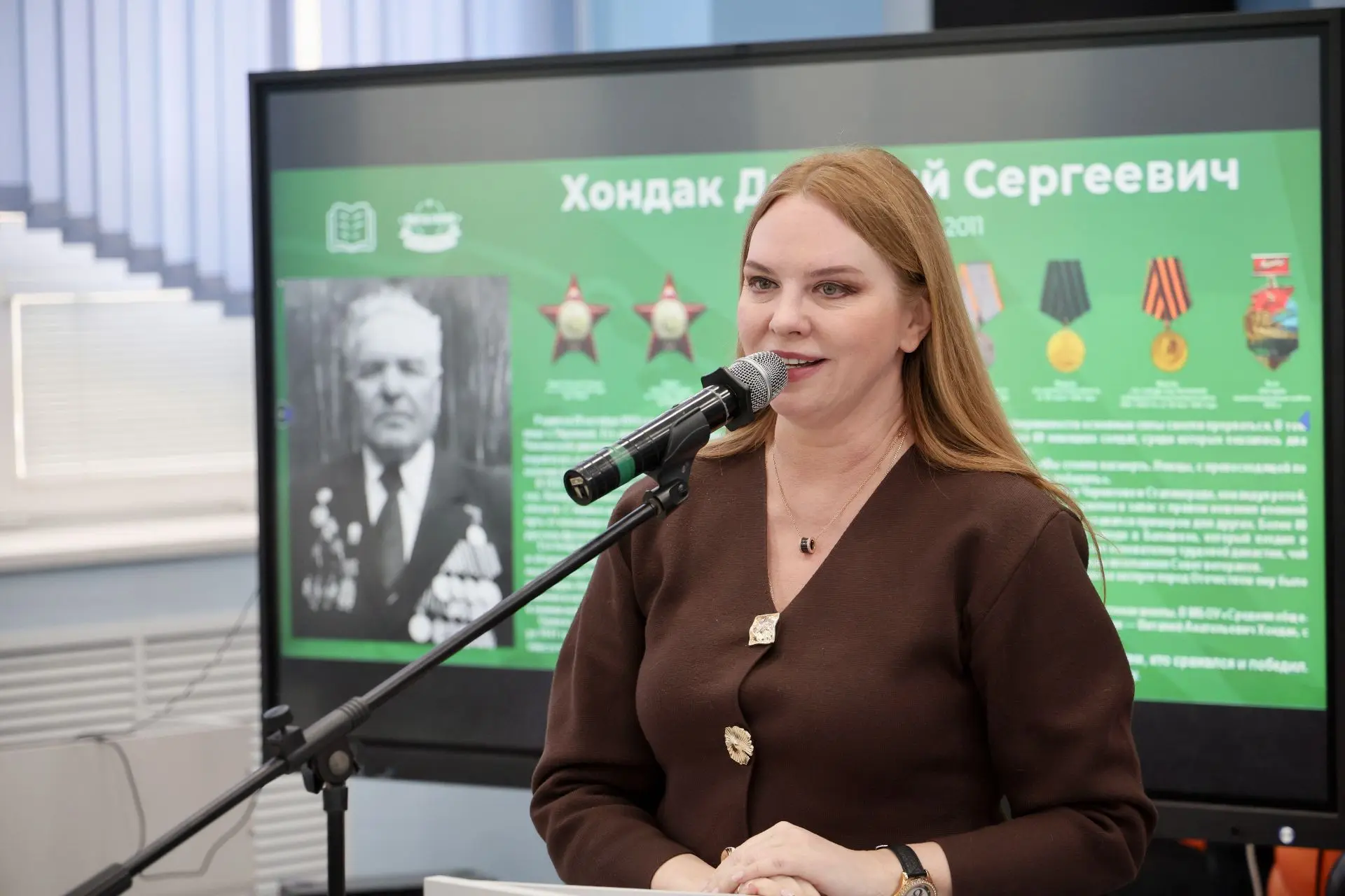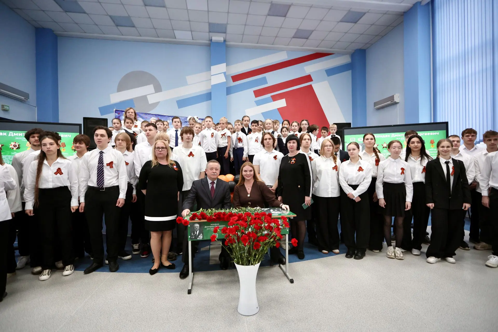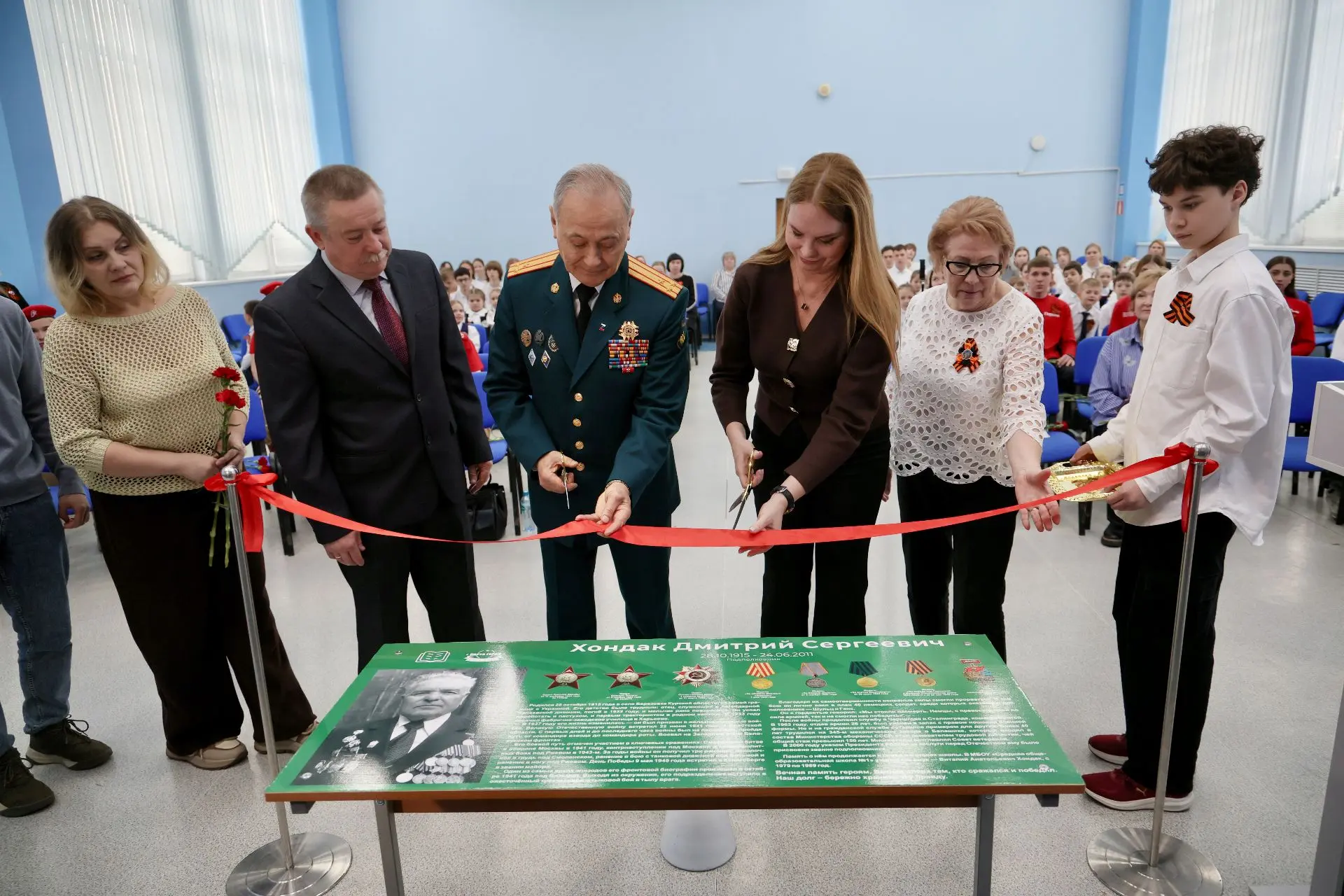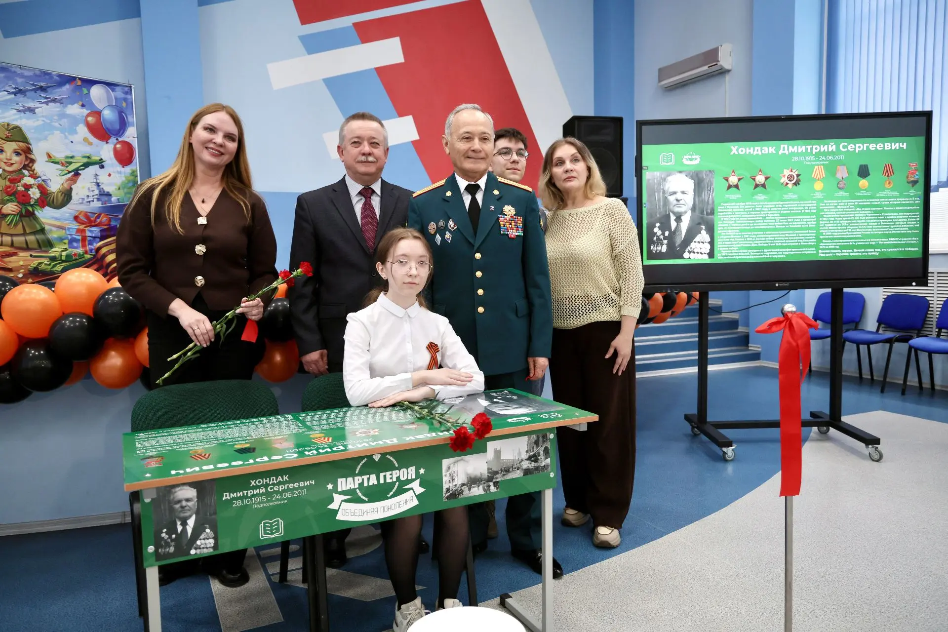 Торжественное открытие Парты Героя, посвященной памяти участника Великой Отечественной войны Дмитрия Хондака прошло в школе № 1 в Балашихе. В церемонии приняли участие генеральный директор ОАО «345 Механический завод» Рустам Гатауллин, родственники героя - внуки Олег Хондак, заслуженная артистка России певица Варвара, Марина Хондак и правнук Иван.
