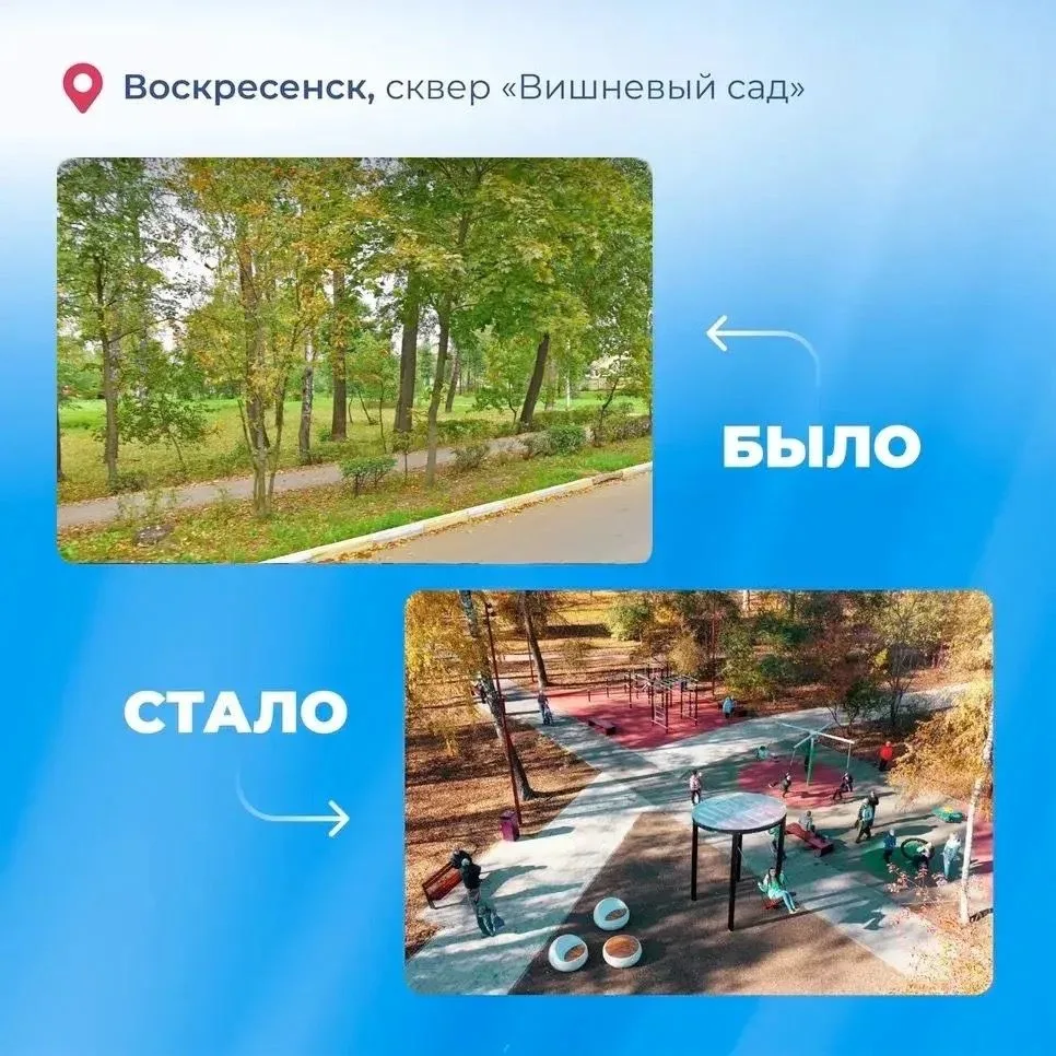 Формирование комфортной городской среды, благоустройство общественных пространств – одно из положений народной программы Единой России. В качестве примера реализации проекта - открытие благоустроенного сквера Вишнёвый сад. Концепция благоустройства Вишнёвого сада формировалась с учётом пожеланий воскресенцев.