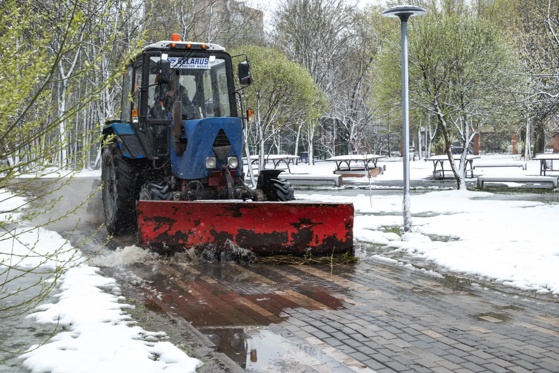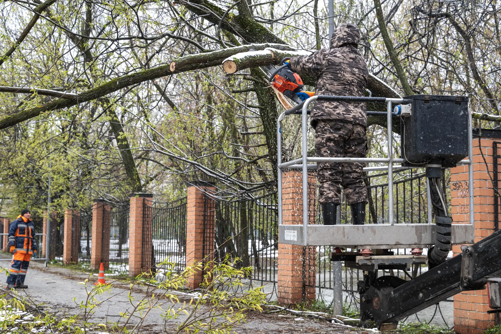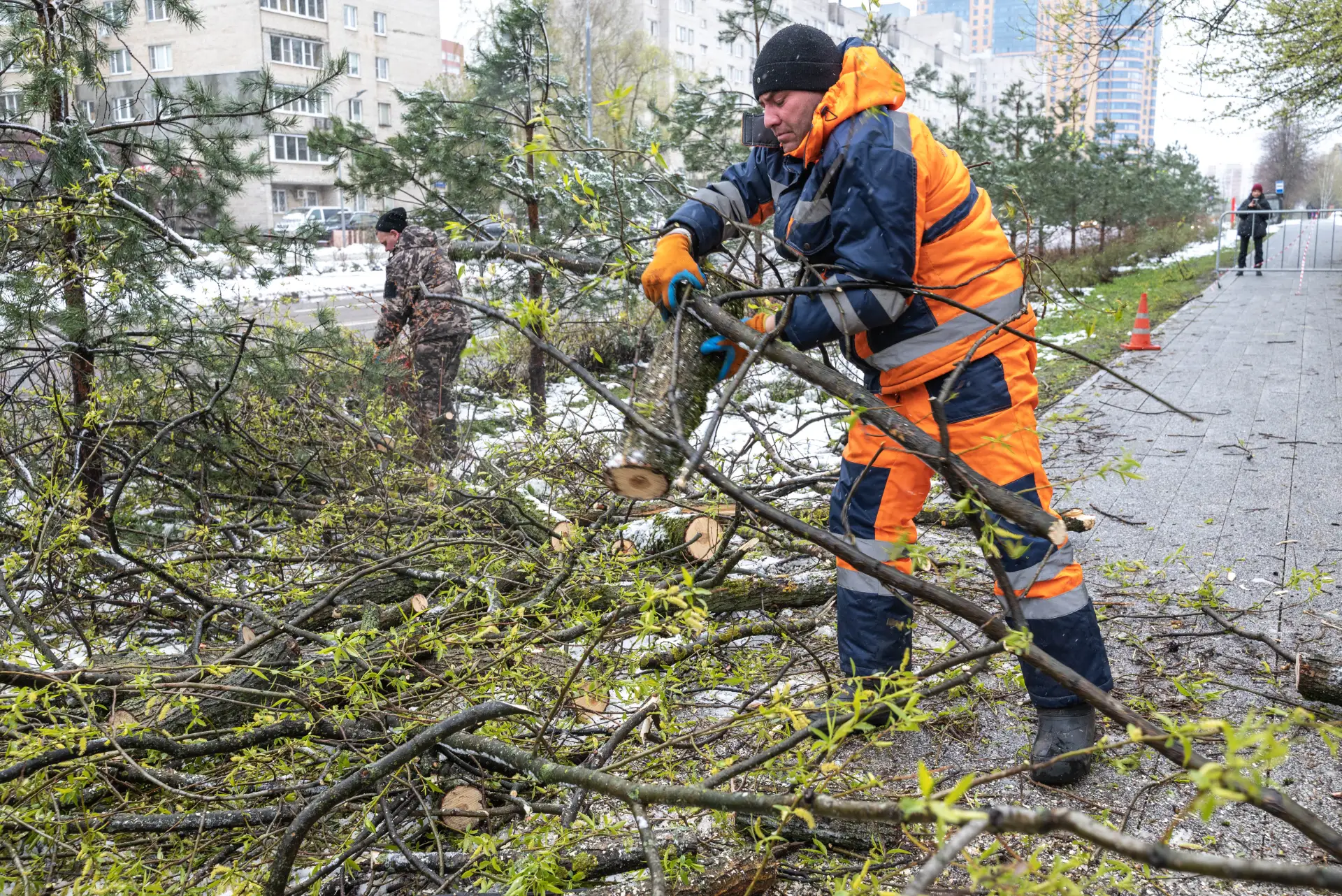 За прошедшие 2 дня в городе было повалено около 100 деревьев. Коммунальные службы города в усиленном режиме убирают снег, опиливают сломанные стволы и ветви, убирая городские территории.