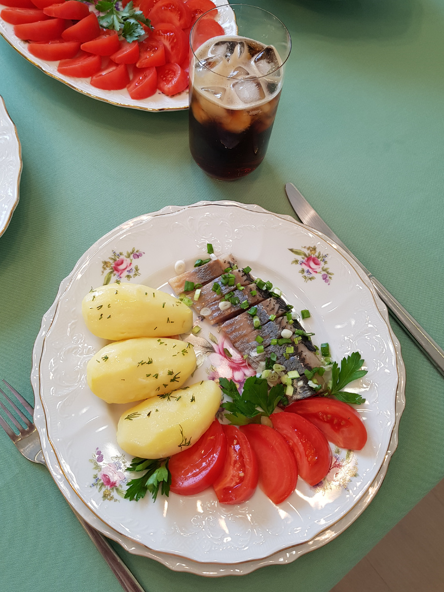 Нарежьте филе на кусочки и выложите на тарелку, посыпав finely нарезанным зеленым луком. Отварите картофель в подсоленной воде, добавьте к нему сливочное масло и укроп — это станет отличным дополнением к селедке. Свежие помидоры также не помешают на этом праздничном столе.