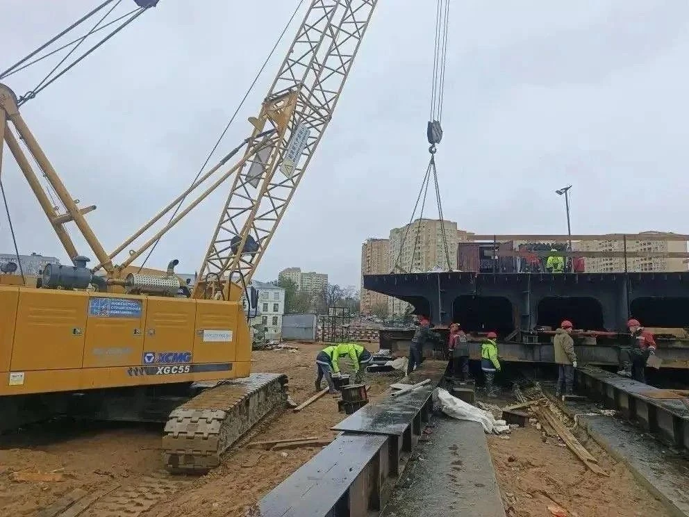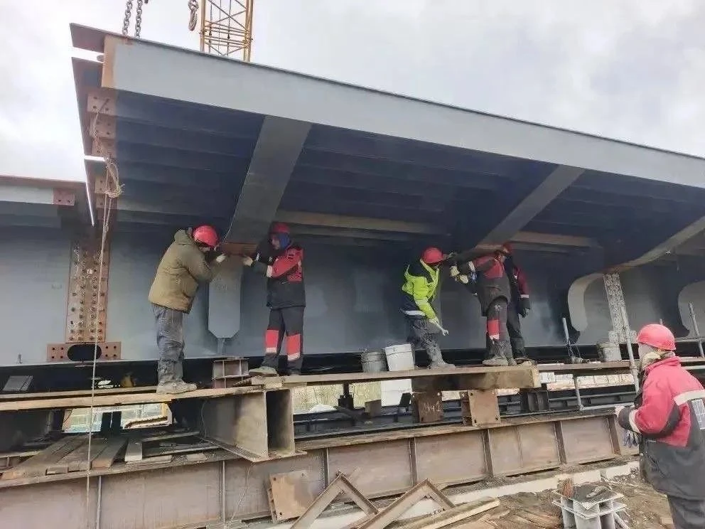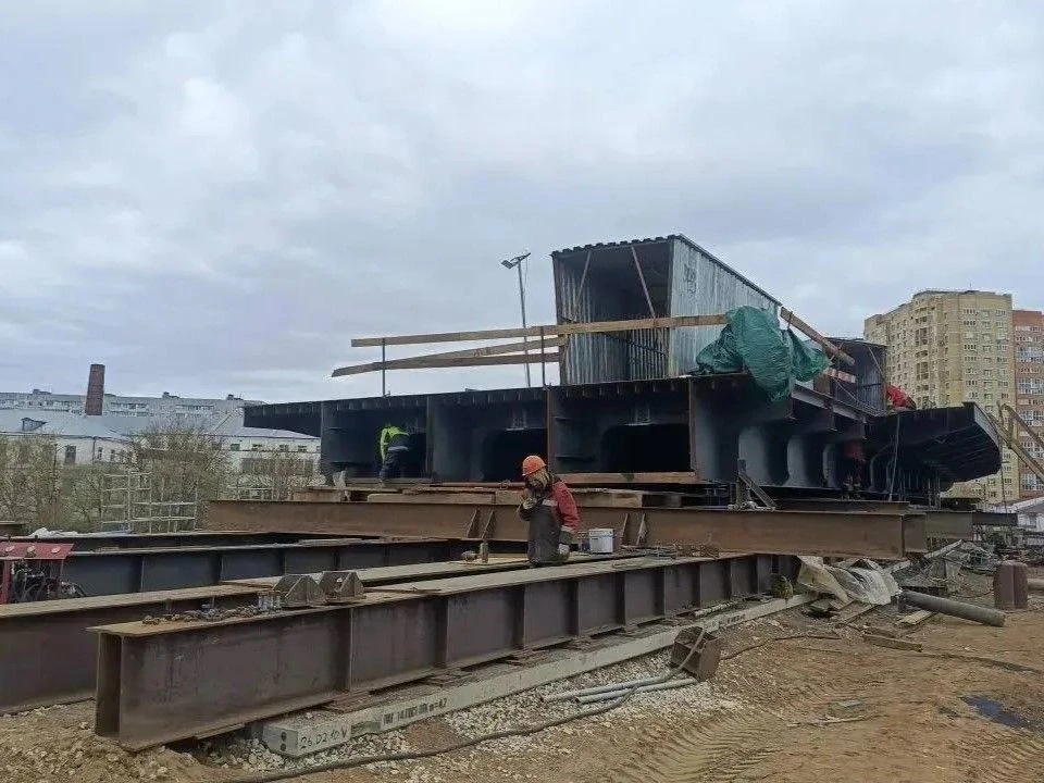 На площадке продолжается укрупнительная сборка металлоконструкций. Из 12 запланированных пролетных строений уже собраны 3, начата надвижка первого блока. Параллельно ведется строительство дождевой канализации.
