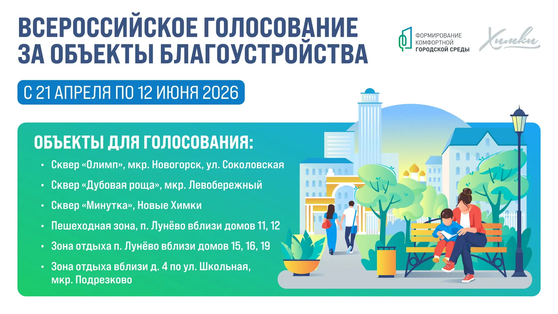В этом году химчане могут проголосовать за шесть территорий: сквер «Олимп» в Новогорске, сквер «Дубовая роща» в Левобережном, сквер «Минутка» в Новых Химках, а также общественные пространства в Лунёво и Подрезково.