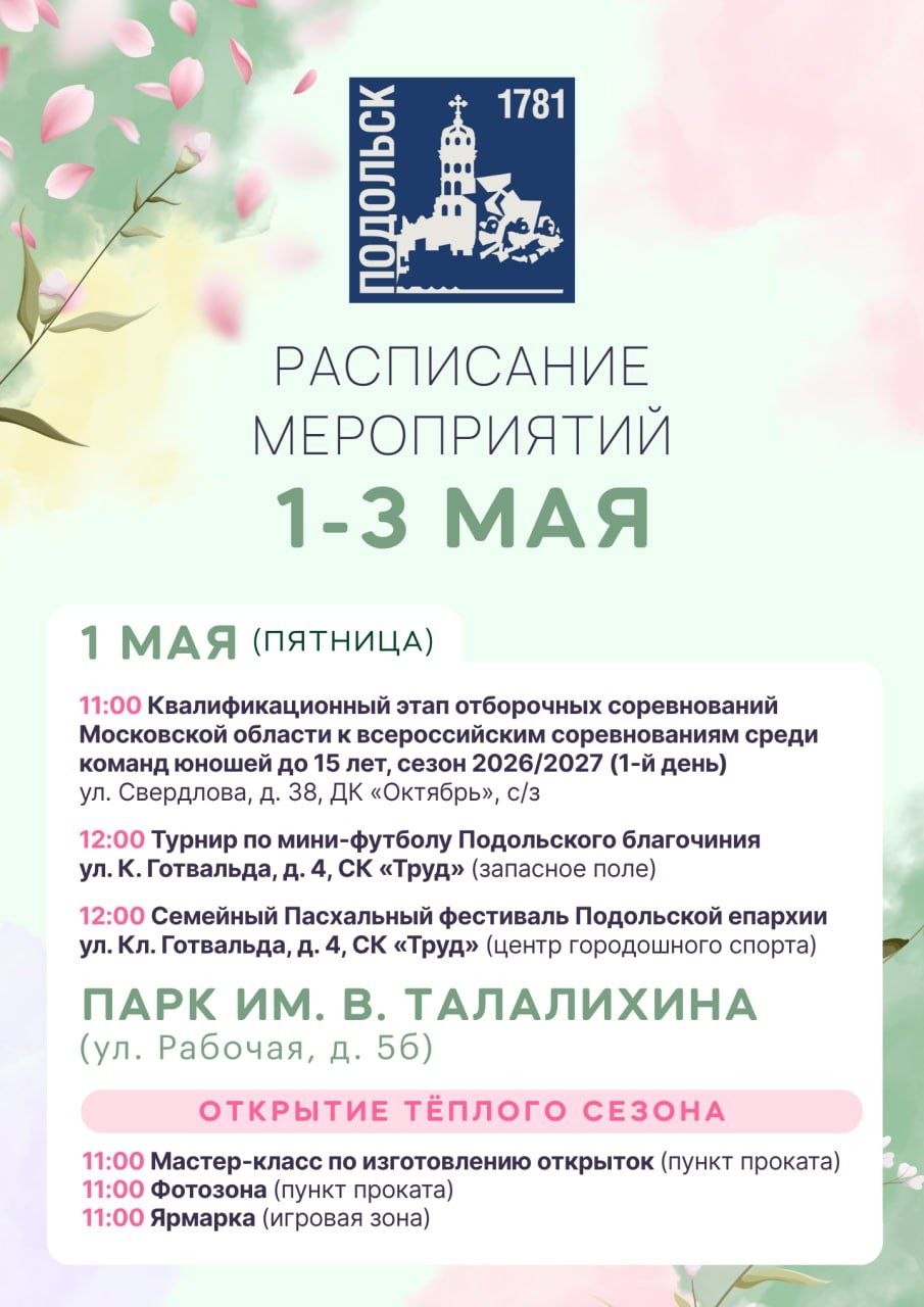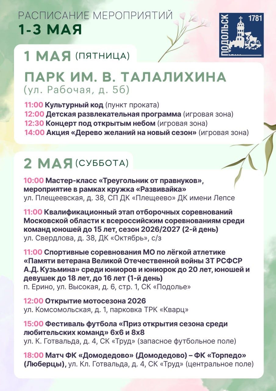 В парке имени Виктора Талалихина гостей ждёт насыщенная программа: выставка ретроавтомобилей, иммерсивный фестиваль «Подольск. Не проездом», тематические площадки музеев и библиотек, историческая экскурсия «Наш старый парк» в 15:00. На главной сцене развернётся настоящее путешествие во времени — театральные миниатюры, бал, цирковые номера и многое другое.